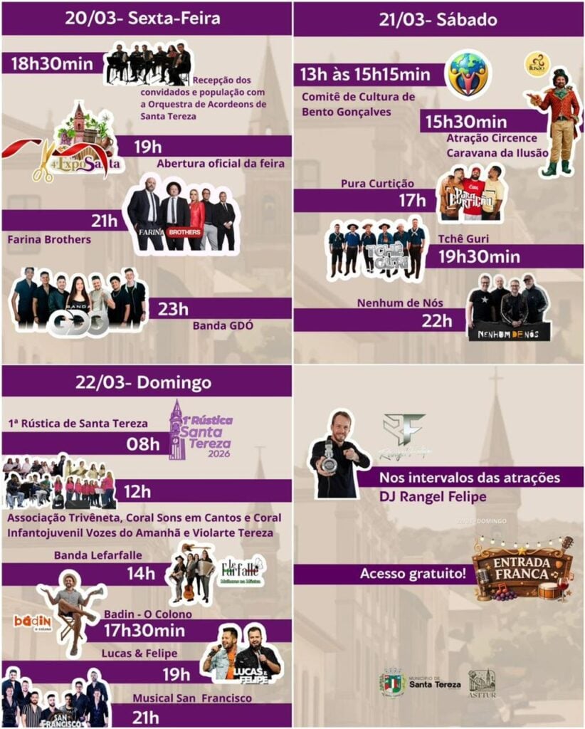 Santa Tereza já tem data para sua maior festa. A 4ª ExpoSanta ocupa a Praça do Porto nos dias 20, 21 e 22 de março de 2026 com grandes shows, comidas típicas, vinícolas, cachaçaria e o melhor da produção local.