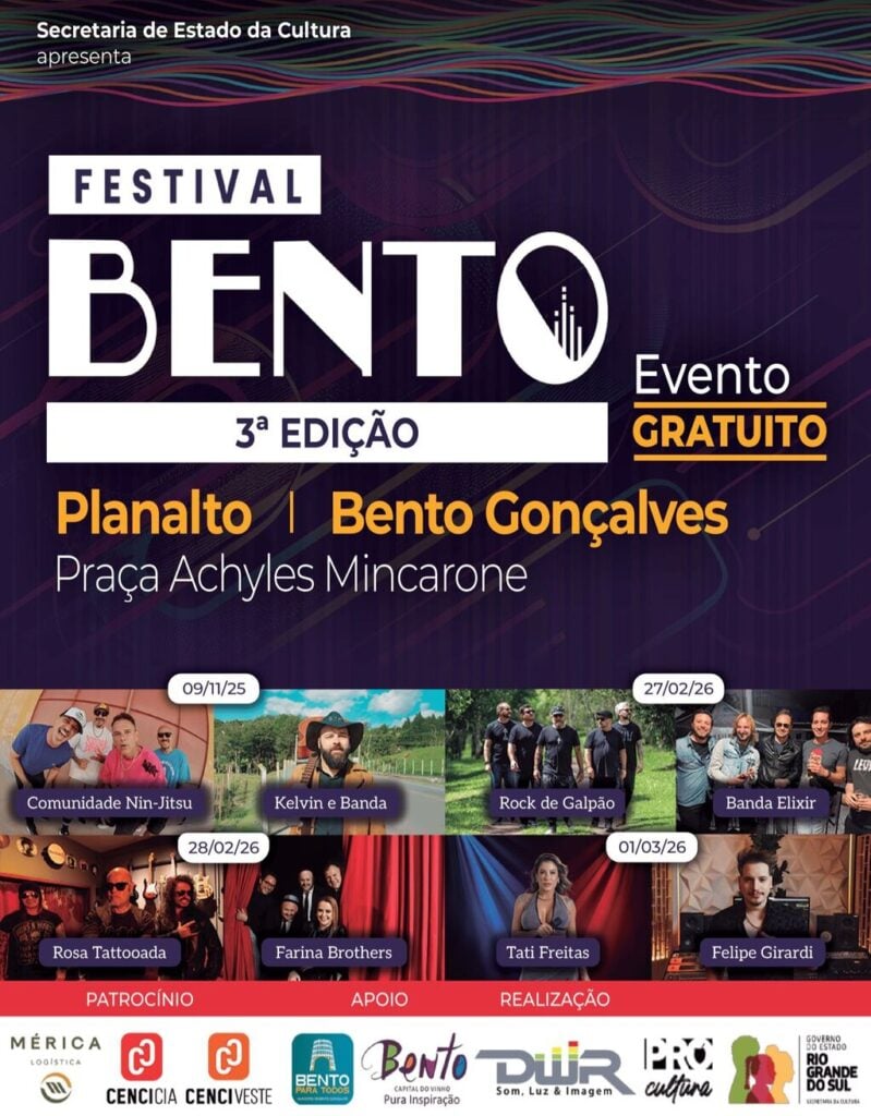 Bento Gonçalves (RS) – O Festival Bento volta a transformar a Praça Achyles Mincarone, conhecida como praça da Igreja São Bento, em um grande ponto de encontro da música, da cultura e da celebração coletiva.