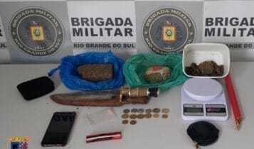 Com o indivíduo foram localizadas porções de maconha, dois comprimidos de MDMA, uma faca, uma balança de precisão e um telefone celular